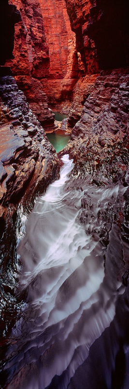 45 minutes after starting my descent I arrived at the top of this incredible waterfall and my jaw dropped. I took a moment to take it all in but then realised it was getting light quickly, I had to move fast if I wanted to nail the best light of the day. I could instantly see a beautiful vertical photograph and set up my medium format film camera with my tripod in the perfect (but very dangerous) position, one wrong move and the front tripod leg would have slipped taking my expensive film camera over the edge and deep into the pool below. As the sun hit the horizon the red walls of the gorge began to glow and I captured this magnificent photograph with an exposure of well over 10 minutes. Confident that I had captured Hancock Gorge at it's absolute finest, I packed my gear away and retreated back to the safety of the world above.